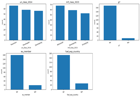 Figure 3 displays a set of bar graphs, each showing the number of countries belonging to particular economic groups. The charts indicate that most examined countries fall into the developing category, while only a small number qualify as developed or advanced economies. Transition economies and emerging markets also appear within the dataset, though in smaller proportions. Regionally, very few countries are part of elite economic groups such as the G7 or the European Union, and only a limited number are classified as significant fuel exporters. Overall, these diagrams reveal the unequal global distribution of wealth and highlight the structural differences that separate various types of national economies (Kuznets, 1955; Piketty, 2014).