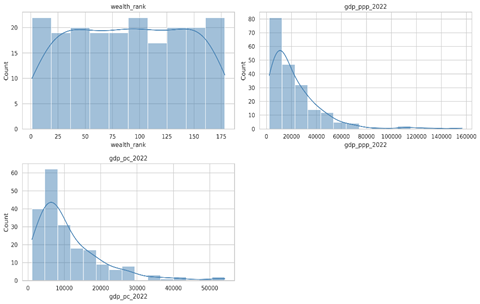 Each histogram shows the overall spread and skewness of the data, highlighting cross-country variation in economic performance. The accompanying image presents four histograms, each illustrating distinct datasets. The top-left plot of wealth rank shows a frequency distribution skewed to the right, suggesting a greater concentration among higher-ranked economies. The top-right plot of GDP PPP 2022 also exhibits right skewness, indicating that most countries have lower PPP-adjusted GDP values. Similarly, the bottom-left plot depicting GDP per capita 2022 shows a right-skewed distribution comparable to GDP PPP 2022. The bottom-right plot appears empty, with no data displayed. Collectively, these visualizations provide an overview of the distribution patterns and variability of wealth and GDP indicators in the dataset (Pritchett, 2020).