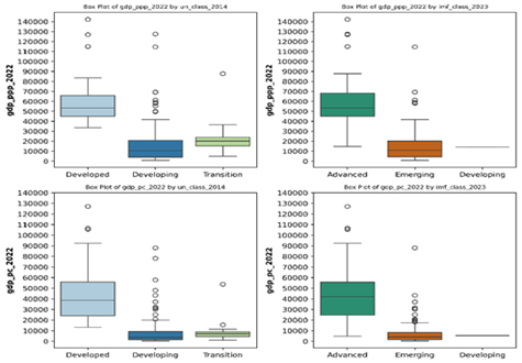 The plots highlight clear income disparities, with developed and advanced economies displaying significantly higher central tendencies and wider variability compared to developing and emerging groups. The image also presents four boxplots illustrating Gross Domestic Product per capita (GDP_PC_2022) and Gross Domestic Product at Purchasing Power Parity (GDP_PPP_2022), categorized by the United Nations (UN) 2014 classification and the International Monetary Fund (IMF) 2023 classification. The first two plots show GDP_PPP_2022 distributions across development categories, where advanced economies display much higher medians and larger spreads due to extremely wealthy outliers. In contrast, developing and emerging economies exhibit lower median values and reduced variability, reflecting more modest but relatively stable economic performance.