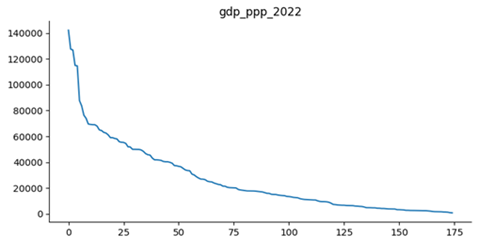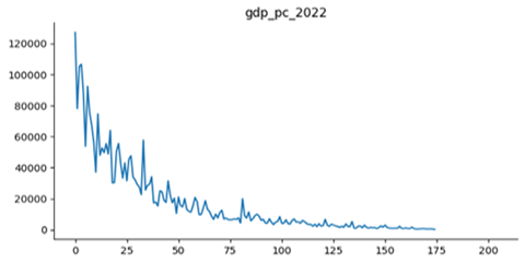 The curve in Figure 5 highlights a high concentration of economic output among the top-ranked countries, followed by a smooth downward gradient and a long tail of lower-PPP nations, reflecting asymmetric global economic distribution. The graph titled “gdp_pc_2022” represents the Gross Domestic Product (GDP) per capita for different countries in 2022. The X-axis denotes the ranked order of these countries, while the Y-axis displays GDP per capita in a common currency unit. The graphical trend shows that as the rank increases, GDP per capita declines sharply—from values above 120,000 down to much lower income levels. The curve also exhibits fluctuations, reflecting the presence of a few small, wealthy nations with exceptionally high GDP per capita despite their lower ranking positions. As the X-coordinate increases further, GDP per capita stabilizes around modest levels, typically near or below 10,000. This distribution is characteristic of global inequality, where only a handful of countries achieve very high income levels while the majority remain at much lower economic positions. Such disparities highlight the persistent imbalance in global wealth distribution and the uneven pace of economic development across nations (Kuznets, 1955 ; Piketty, 2014).