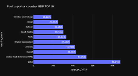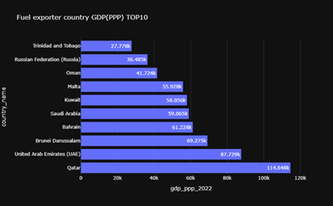 A complementary bar chart presents the ten leading fuel-exporting countries ranked by GDP (PPP) in 2022, which adjusts for cost of living and inflation to provide a more accurate measure of economic well-being. Qatar once again ranks first with a GDP (PPP) of $114.648k, reaffirming its position as one of the richest countries globally due to extensive oil and gas production. Its elevated GDP (PPP) highlights the substantial purchasing power and high standard of living of its citizens (BP, 2023; International Energy Agency, 2023).