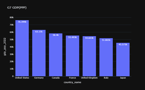 The bar chart in Figure 10 illustrates the Gross Domestic Product (GDP) per capita adjusted for Purchasing Power Parity (PPP) for all Group of Seven (G7) nations in the fiscal year 2022. The G7 comprises seven of the world’s most advanced economies—the United States, Germany, Canada, France, the United Kingdom, Italy, and Japan. GDP per capita adjusted for PPP provides a more accurate measure of economic performance, as it accounts for differences in cost of living and inflation across countries. This adjustment enables a fairer comparison of productivity levels, real income, and living standards among the member economies (Deaton, 2022; World Bank, 2022).