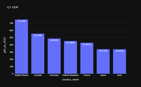 This bar chart highlights the economic divide among the G7 nations, demonstrating the United States’ continued dominance in per capita income and purchasing power. The observed variations in GDP per capita can be attributed to factors such as differences in labor productivity, employment rates, industrial composition, fiscal policies, and demographic characteristics (Barro, 2021). Overall, the visualization situates each G7 country within the context of its economic standing for 2022, revealing structural disparities despite their collective classification as advanced economies (Piketty, 2014).