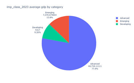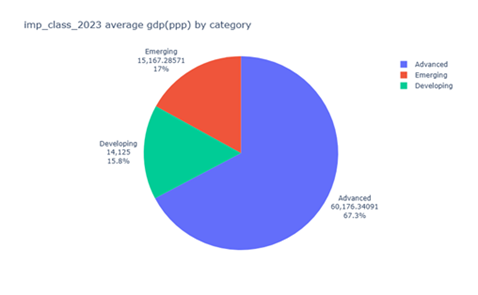 The second pie chart, illustrating average GDP (PPP) by classification for 2023, reinforces this disparity. Advanced economies again account for the majority of global PPP-adjusted GDP, reflecting their strong industrial bases, advanced technological sectors, and mature service industries. Emerging economies occupy an intermediate position, while developing economies capture only a small share, despite larger populations (Piketty, 2014; Pritchett, 2020).