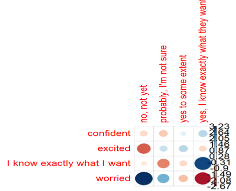 Graduates Emotional ReadinessAnalysis of correspondence highlighted a statistically significant correlation between emotional readiness and work planning measured by self-confidence and stress levels. Graduates with clear career goals had higher confidence, while graduates with no clear aspirations were reported to have higher levels of anxiety. The chi-square examination confirmed a statistically significant correlation (X² = 40.33, p < 0.001, Cramer’s V = 0.45). A student responded that “not knowing where I will work after my graduation makes me always stressed”. So, career clarity is important for a smooth transition from graduation to employment. The other correspondence analysis results also showed a significant impact.