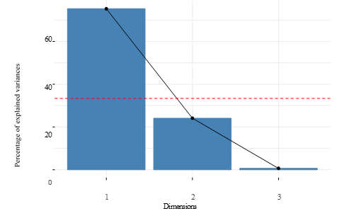 Figure 2 presents the biplot from correspondence analysis, which illustrates a strong association between graduates’ emotional readiness and career goal clarity. Graduates who have well-defined career goals feel confident and excited. The first two dimensions in the biplot explain approximately 95% of the total variance, as also shown in the scree plot (Figure 3), capturing the key emotional and planning-related factors influencing perceived work readiness.